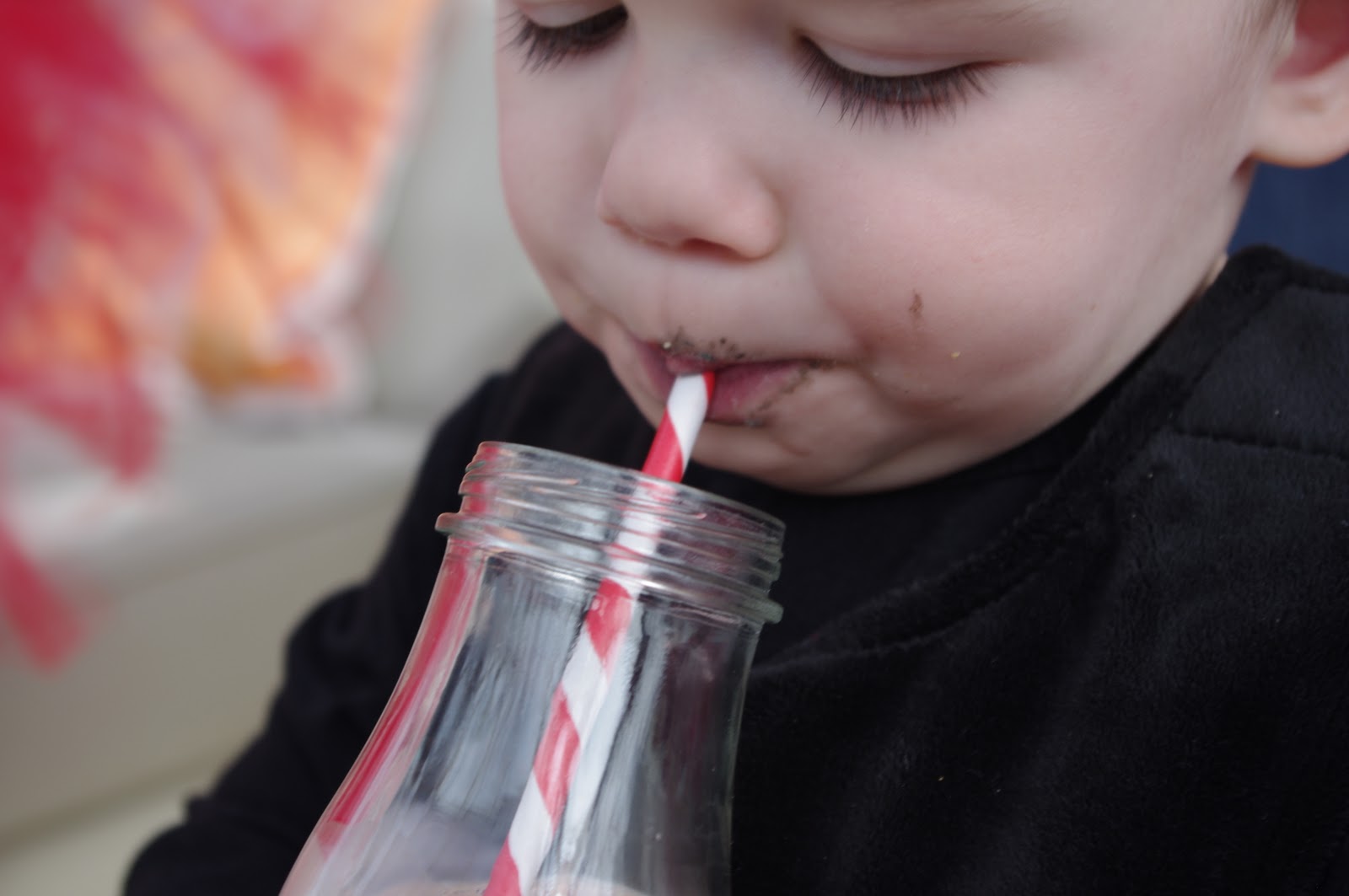 Let me be honest here. Probably 50 of my 150 pictures were of the milk bottles but how cute are they? They were White Wale #2 of the party. I had seen them on so many party blogs but had a hard time finding them to buy. When I finally decided to spend $2.00 per bottle on teeny tiny ones online, they were sold out. I came across an idea where someone had taken a Starbucks Frappuccino bottle and taken the label off to use as a milk bottle. For $1.46 a bottle we had what we were looking for and a delicious coffee treat :) I am also in love with these red and white striped straws. The Househusband had bought a pack of these for me for Valentine's Day. Does he know me or what?